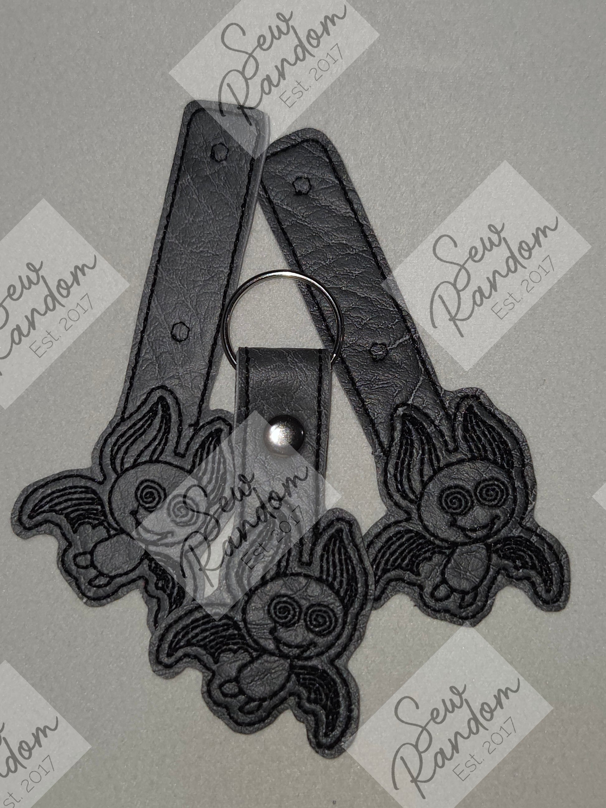 Faux leather keyring with an embroidered design and silver coloured ring and rivet