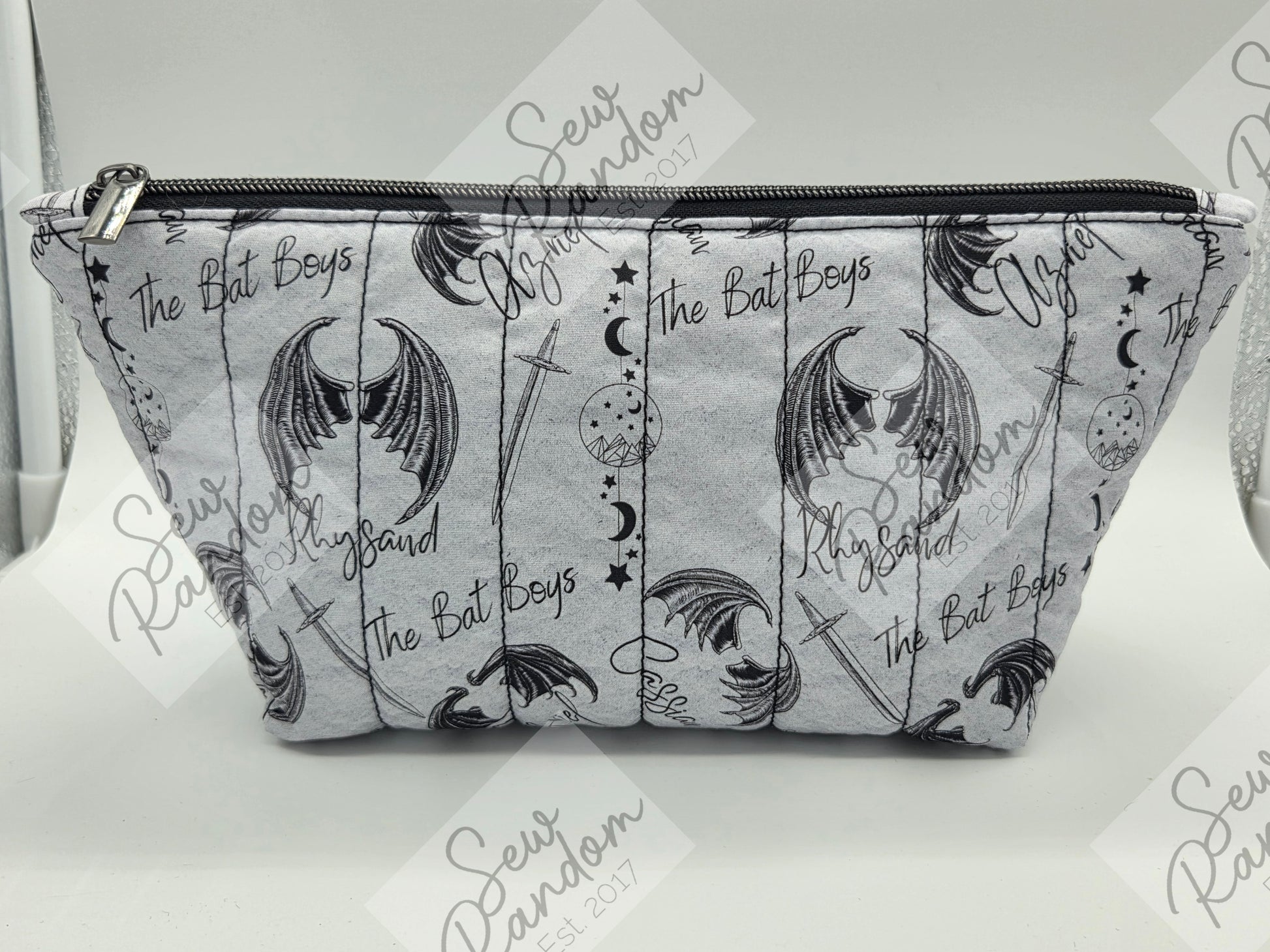 Quilted zip up bag made from 100% cotton for the exterior and water resistant canvas for the interior. I had this fabric printed by a local small business.