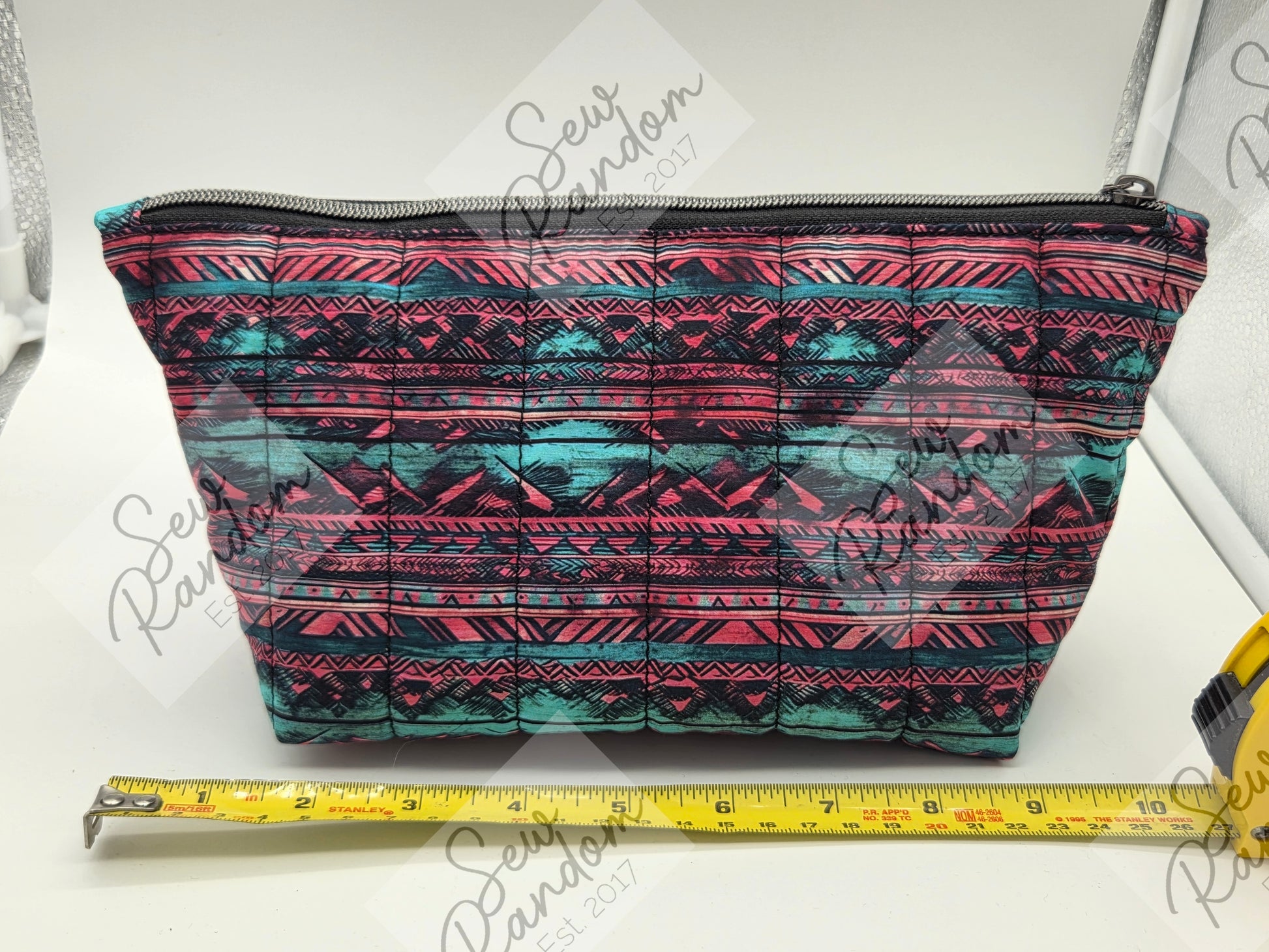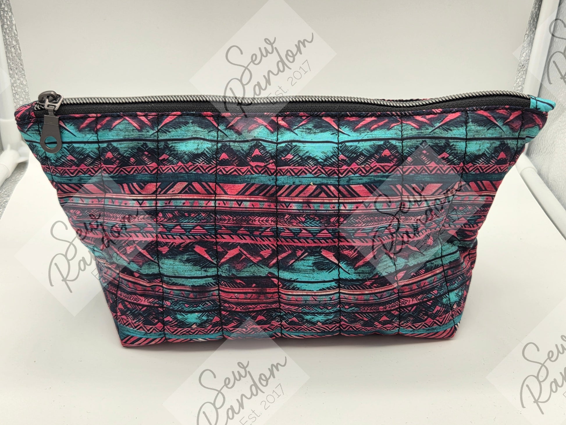 Quilted zip up bag made from 100% cotton for the exterior and polyester for the interior. I had this fabric printed by a local small business.
