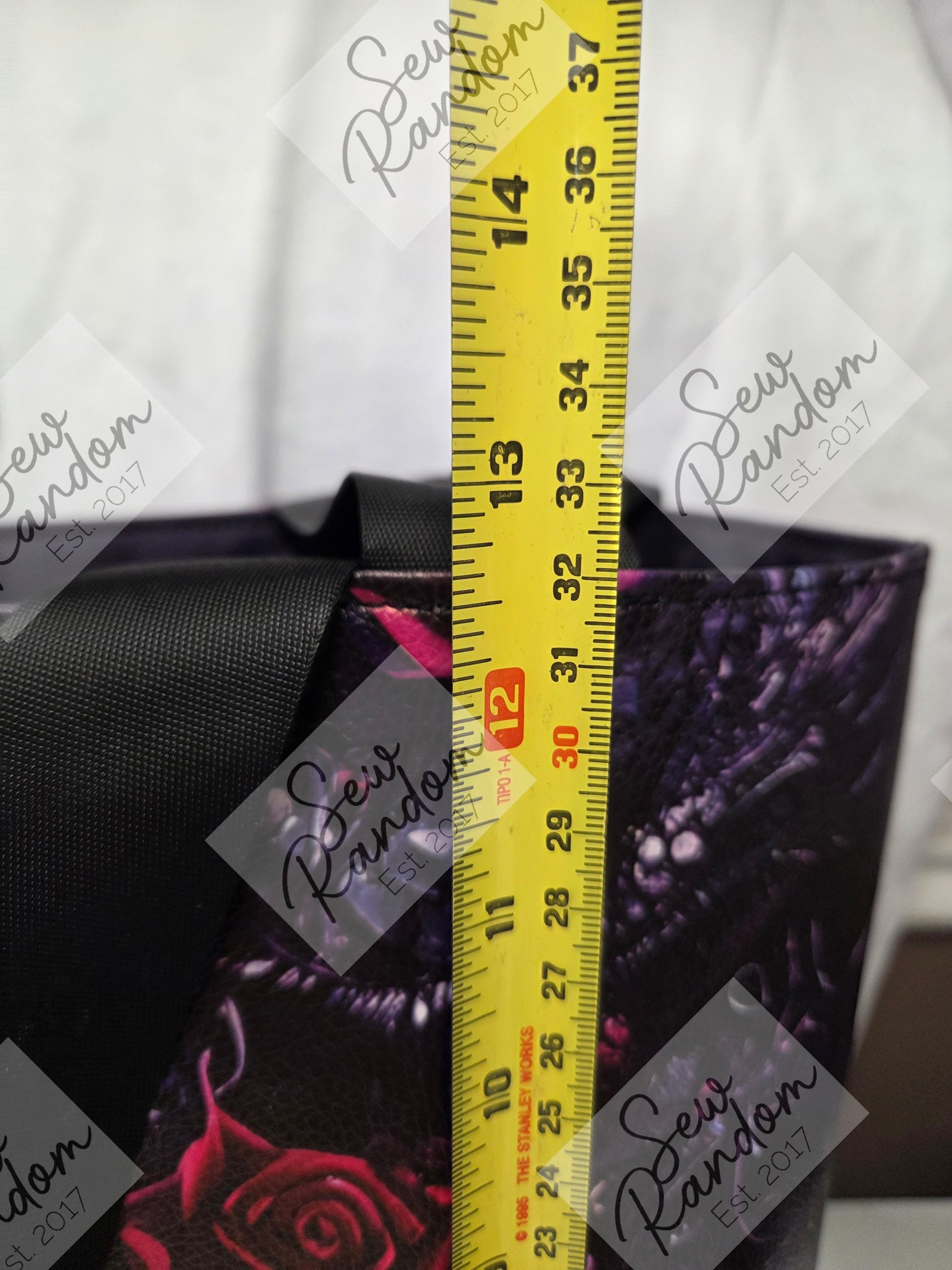 Handmade tote bag made using printed vinyl and faux leather for the exterior and purple water resistant canvas for the lining.